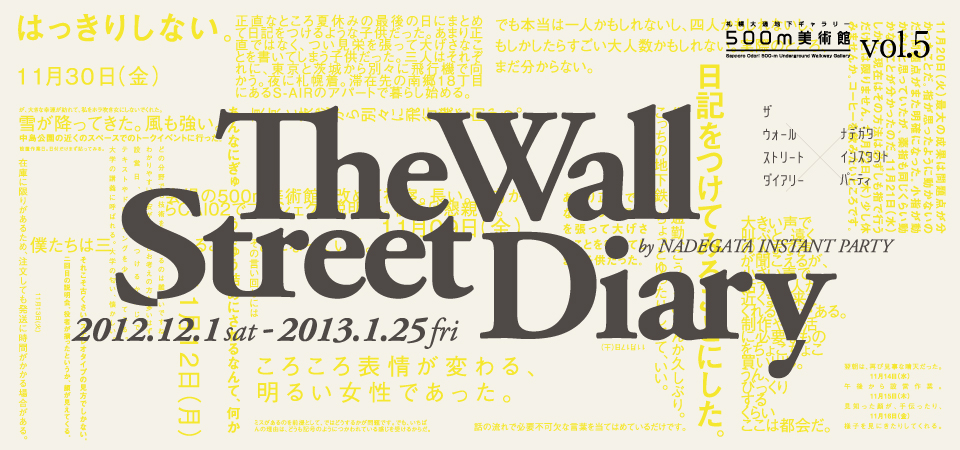 500m美術館vol.5は、11月10日よりNadegata Instant Partyのソロプロジェクト「The Wall Street Diary」を開催します。