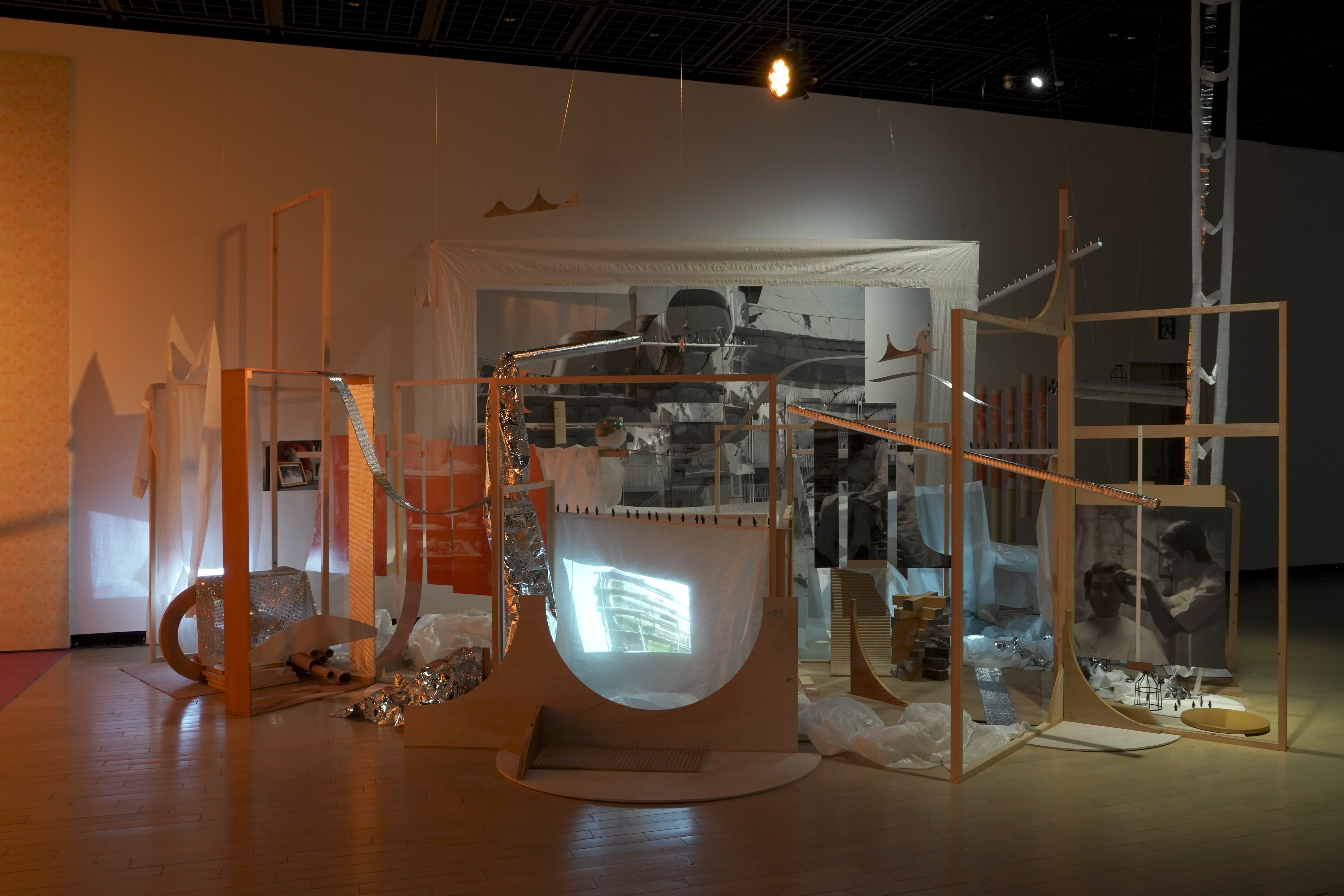 空間そのものを作品化するインスタレーションを考察する展覧会「ながめのいい場所」は、500m美術館の特徴とも言える正面性のある横長のガラスケースというある種独特なスペースに5名のアーティストが空間を構成する。