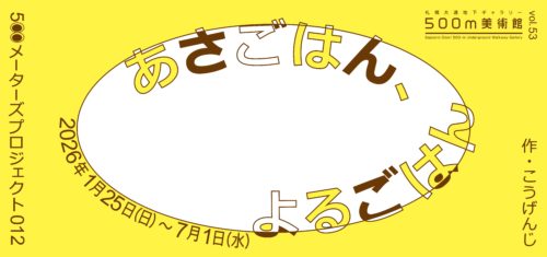 お知らせNews 展覧会情報Exhibition 500m美術館賞Award 過去の展覧会Archive 施設概要About アクセスAccess 開催中 500m美術館 vol.53 第13回500m美術館賞 入選展 2026年1月25日(日)〜3月25日(水) 開催中 500m美術館 vol.53 500メーターズプロジェクト012 「あさごはん、よるごはん」 作・こうげんじ 2026年1月25日(日)〜7月1日(水) News お知らせ 2026.02.10 第13回500m美術館賞 グランプリ受賞者発表! 2026.01.25 【中止のお知らせ】第13回500m美術館賞 グランプリ授賞式+講評会 2025.12.18 「北海道美術学生選抜展」の設営風景(動画)を公開しました! 2025.11.17 第13回500m美術館賞 入選者4名発表! 2025.10.01 500m美術館 vol.51「The WALL vol.6 KINJO」の設営風景(動画)を公開しました! 2025.10.01 500m美術館 vol.51「散歩してみた」の設営風景(動画)を公開しました! お知らせ一覧